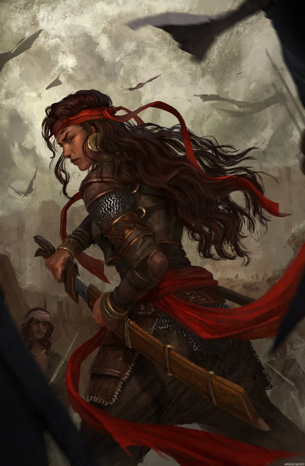 long hair and is wearing armor with a red sash around her waist, suggesting she might have a role of importance within the context of this scene, such as being a warrior or leader. There's a chaotic background that includes elements like birds flying in the sky, which adds to