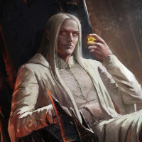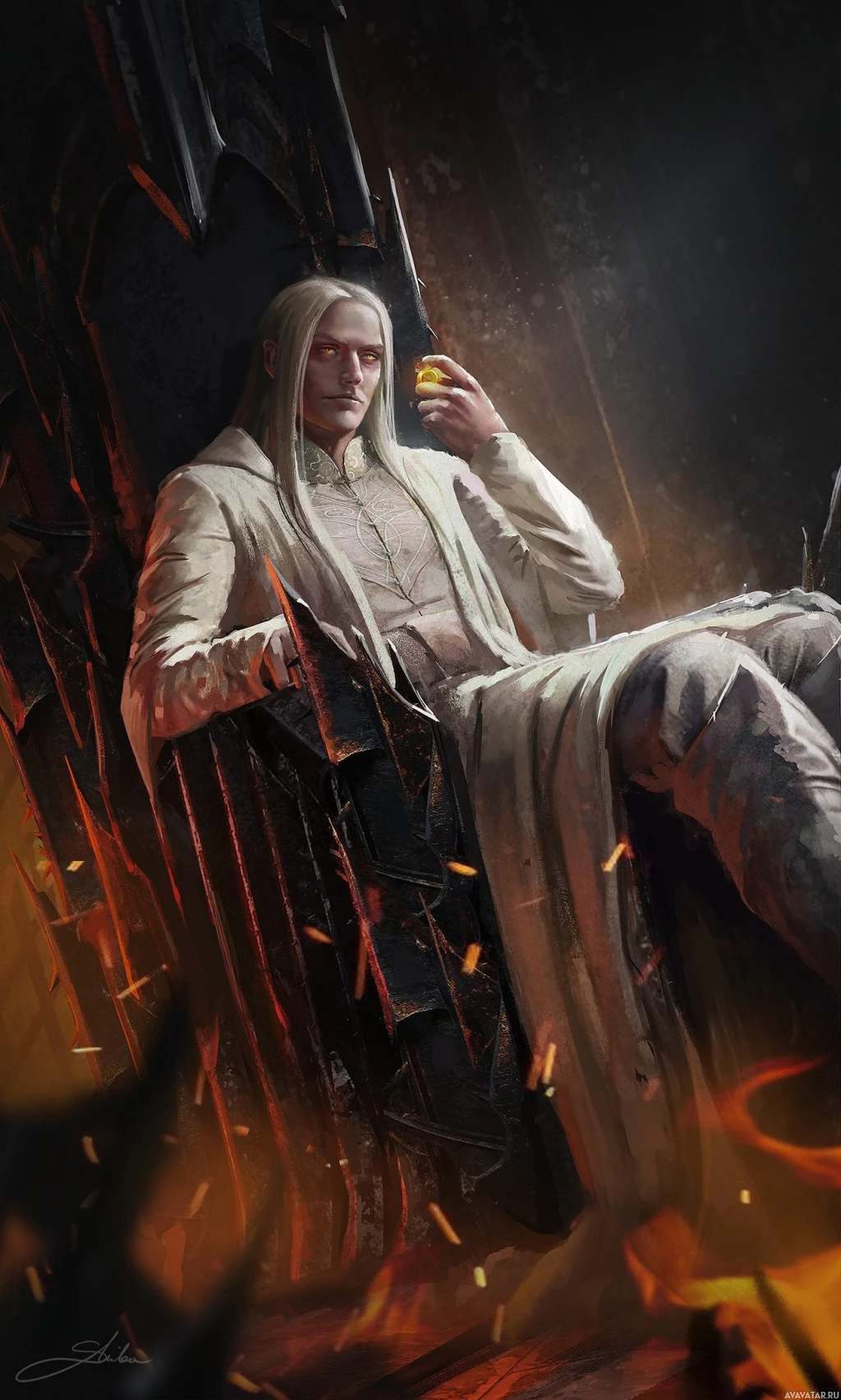 white hair. This character is often associated with Middle-earth, as it is a fantasy setting commonly known for its involvement in stories like those found in J.R.R. Tolkien's works. The character is sitting on a throne or a chair, suggesting