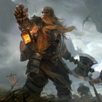 a fantasy scene with several characters. In the foreground, there is a dwarf warrior wielding a large two-handed axe and wearing