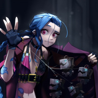 mechanical arms, which are part of her abilities within the game. Jinx is known for her playful nature and for having a love-hate relationship with the character Seraphine in