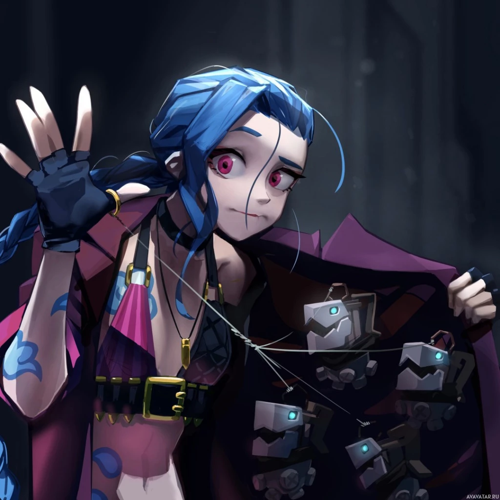 an animated character, Jinx from the game "League of Legends," which is a popular online multiplayer battle arena game. In the illustration, she is depicted in her classic outfit with her
