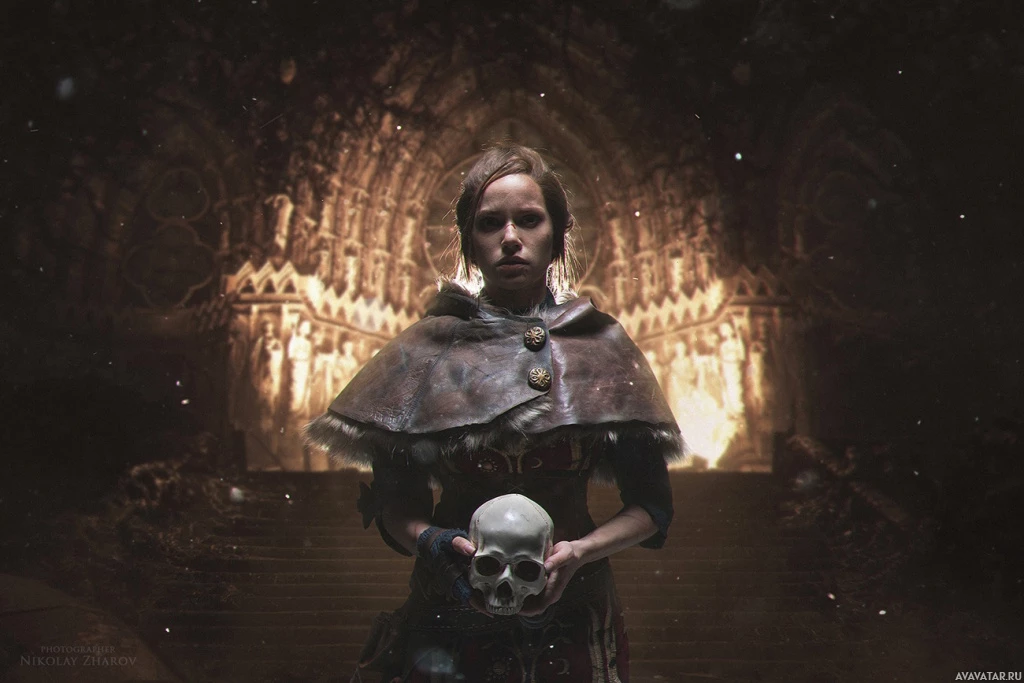 the video game "Assassin's Creed: Valhalla," given the context provided. This character is dressed in what appears to be Viking-era attire and is holding a skull in one hand while gazing towards something off to the side with