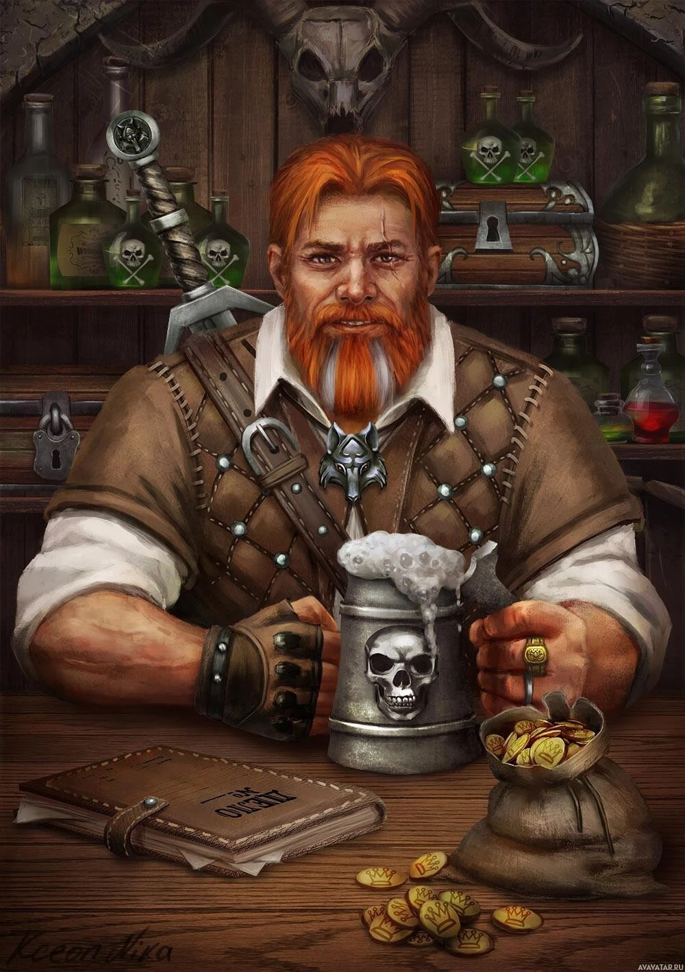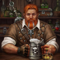 items on the table before him that suggest a setting of a tavern or an alchemist's shop, including additional mugs, bottles, and books. The overall atmosphere suggests a scene of relaxation or contemplation in