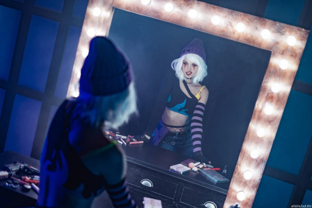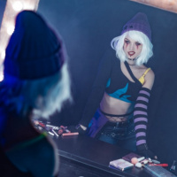 a game character, and there is makeup on the face. The setting looks like it could be part of a stage or performance environment, given the lighting and design elements visible in the photo.