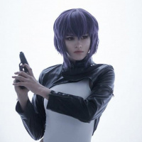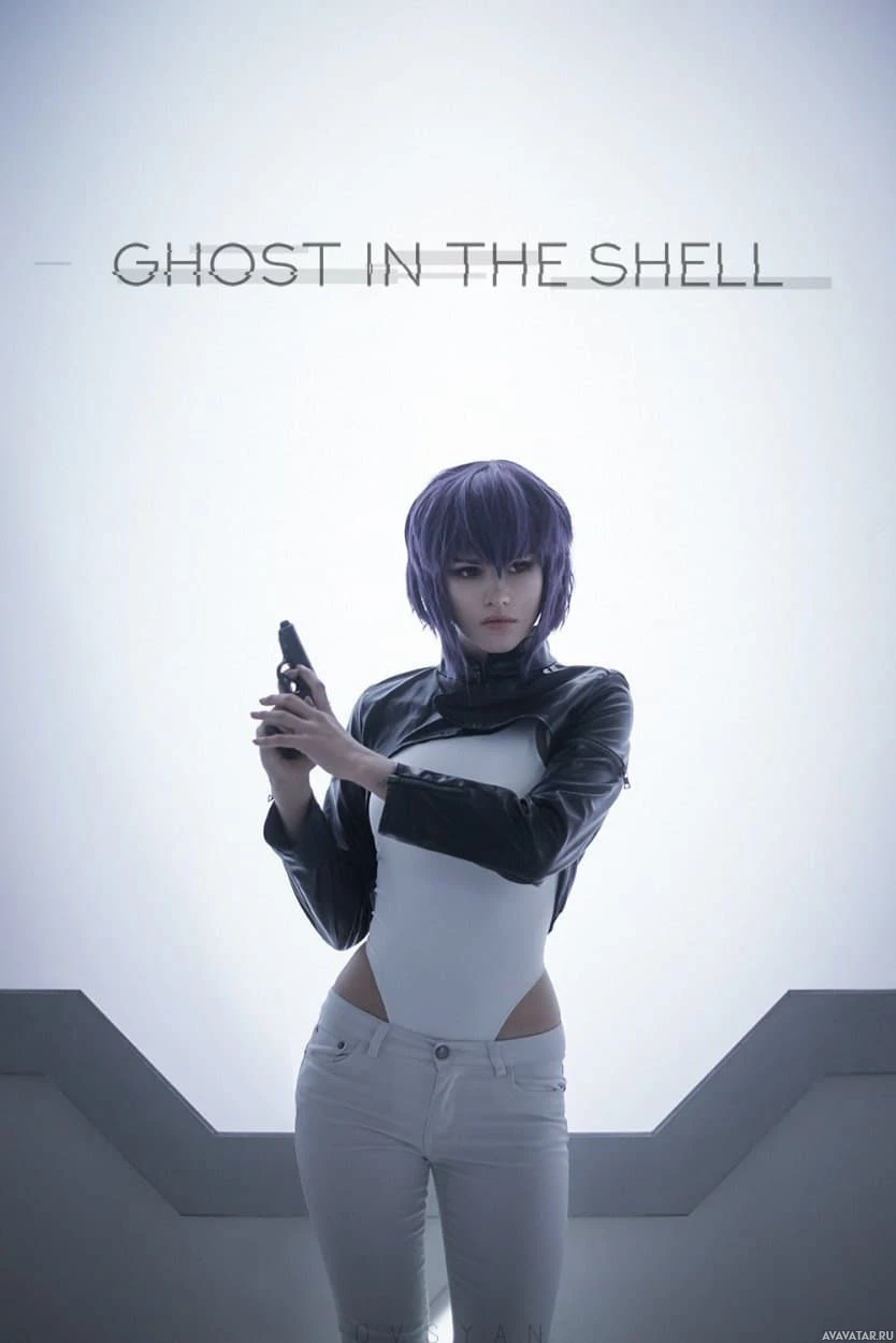 The image shows a person in cosplay, dressed as Major Motoko Kusanagi from
