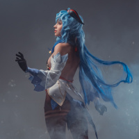 The image shows a character from the video game "Genshin Impact." The character is depicted from behind, wearing a costume that includes a blue outfit with white accents and has an elemental bow. This cosplay of the character is likely created by a fan who enjoys dressing up as their favorite characters from the game.