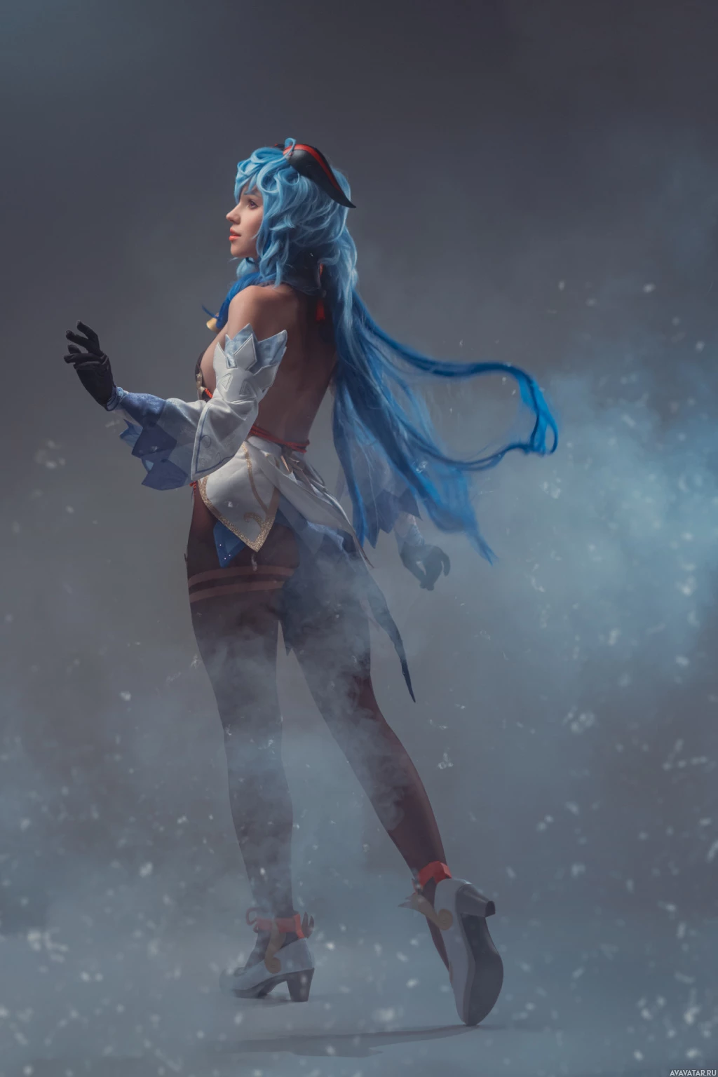 На картинке изображен персонаж из видеоигры "Genshin Impact". Персонаж изображен сзади, в костюме, который включает в себя синюю одежду с белыми вставками и бант-элементаль. Этот косплей персонажа, скорее всего, создан фанатом, которому нравится наряжаться в костюмы своих любимых персонажей из игры.