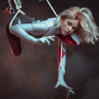 Gwen Stacy, a fictional character from comic books and movies. This individual is wearing a costume that resembles Spider-Man's suit, with spider-like accents and web patterns. They are hanging on a web of ropes or cables, simulating the pose of Spider-