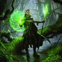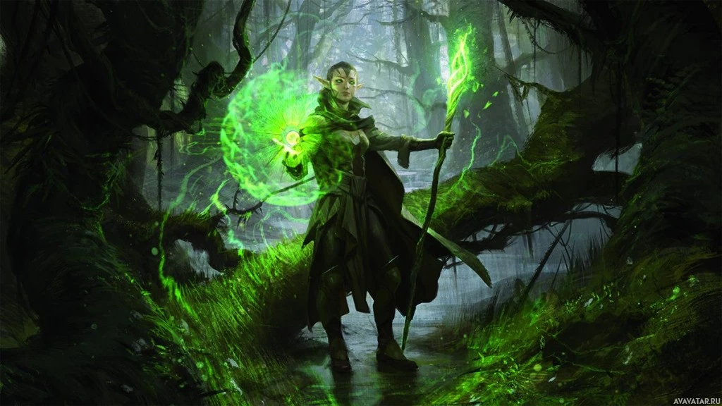 a forest setting, surrounded by green moss and mist, which contributes to the mystical atmosphere of the scene. They are holding a staff with what seems like
