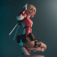 a pizza cutter, and they have their right hand raised in a gesture that could be interpreted as a sign of victory or confidence. The person is wearing a costume with red and white colors, which are characteristic of the Gwenpool character's appearance. The background suggests