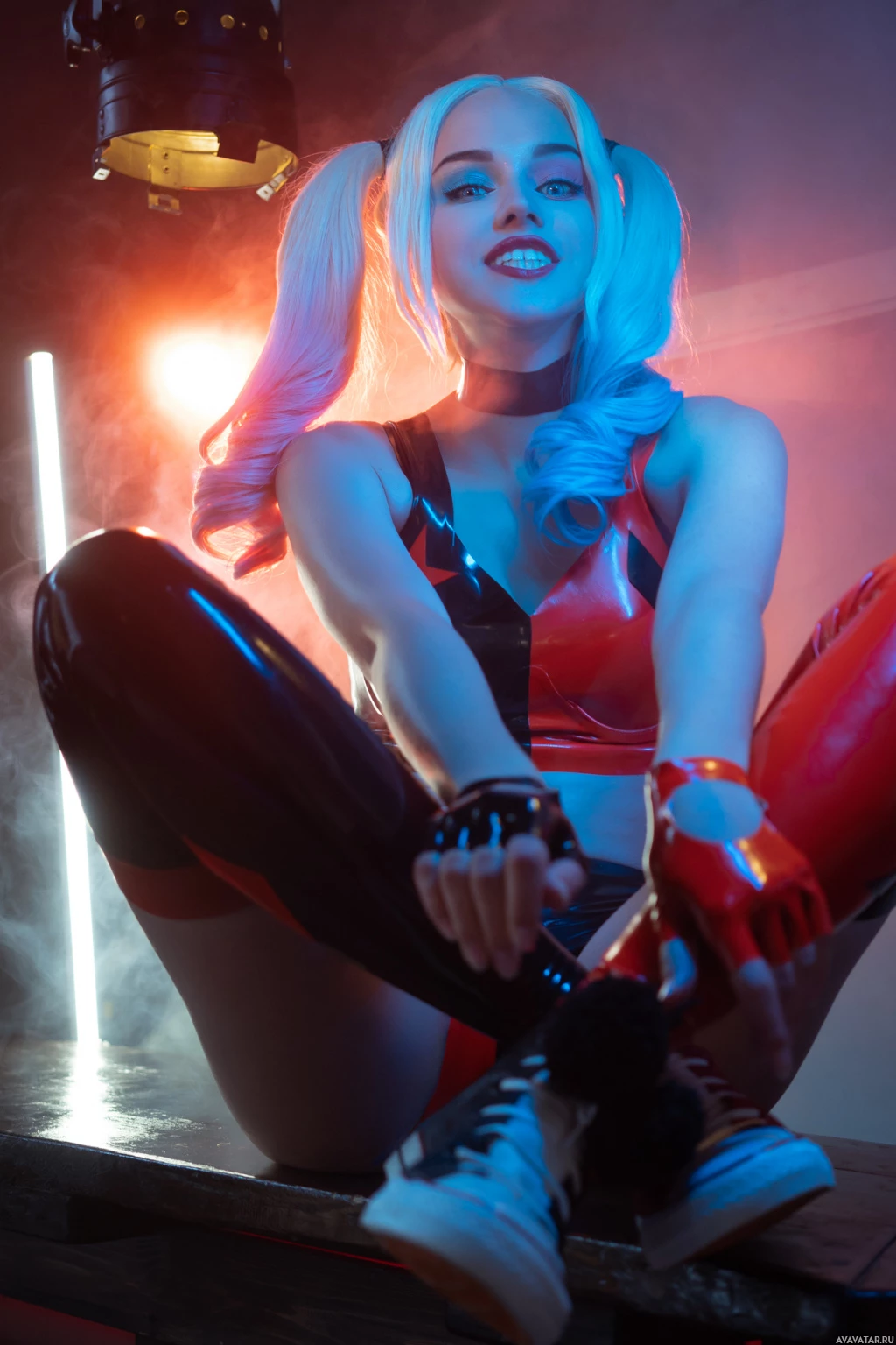 Harley Quinn from the DC Comics universe. The costume includes a red and black bodysuit, fishnet gloves, and