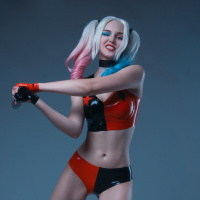 the Harley Quinn look. The person is striking a pose that captures the energetic and edgy style of the character.