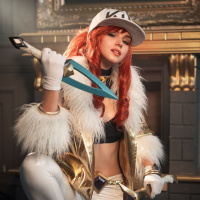 video game "League of Legends." They are wearing a costume that includes a red wig, furry boots, and a bodysuit with