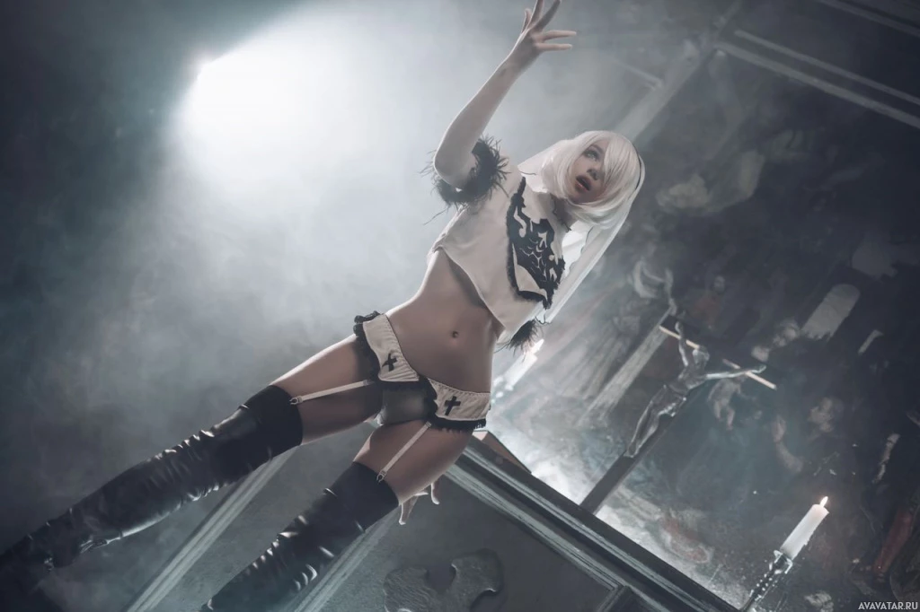 the video game "Nier: Automata." The cosplayer is wearing a costume with