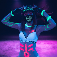 League of Legends." They are wearing a bodysuit that resembles a character's skin and muscles with neon highlights, a face mask or makeup that gives the appearance of