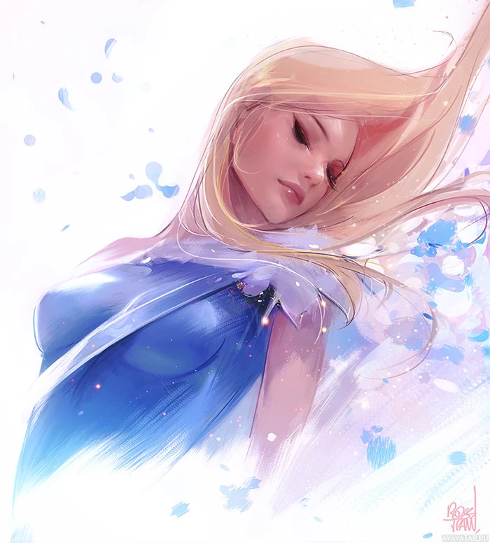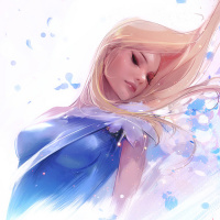 a blue garment that could be interpreted as a dress or robe, and there are light blue floral elements around her that add a soft, dreamy quality to the scene. The overall feel of the image is serene and calm, with a gentle backdrop that complements