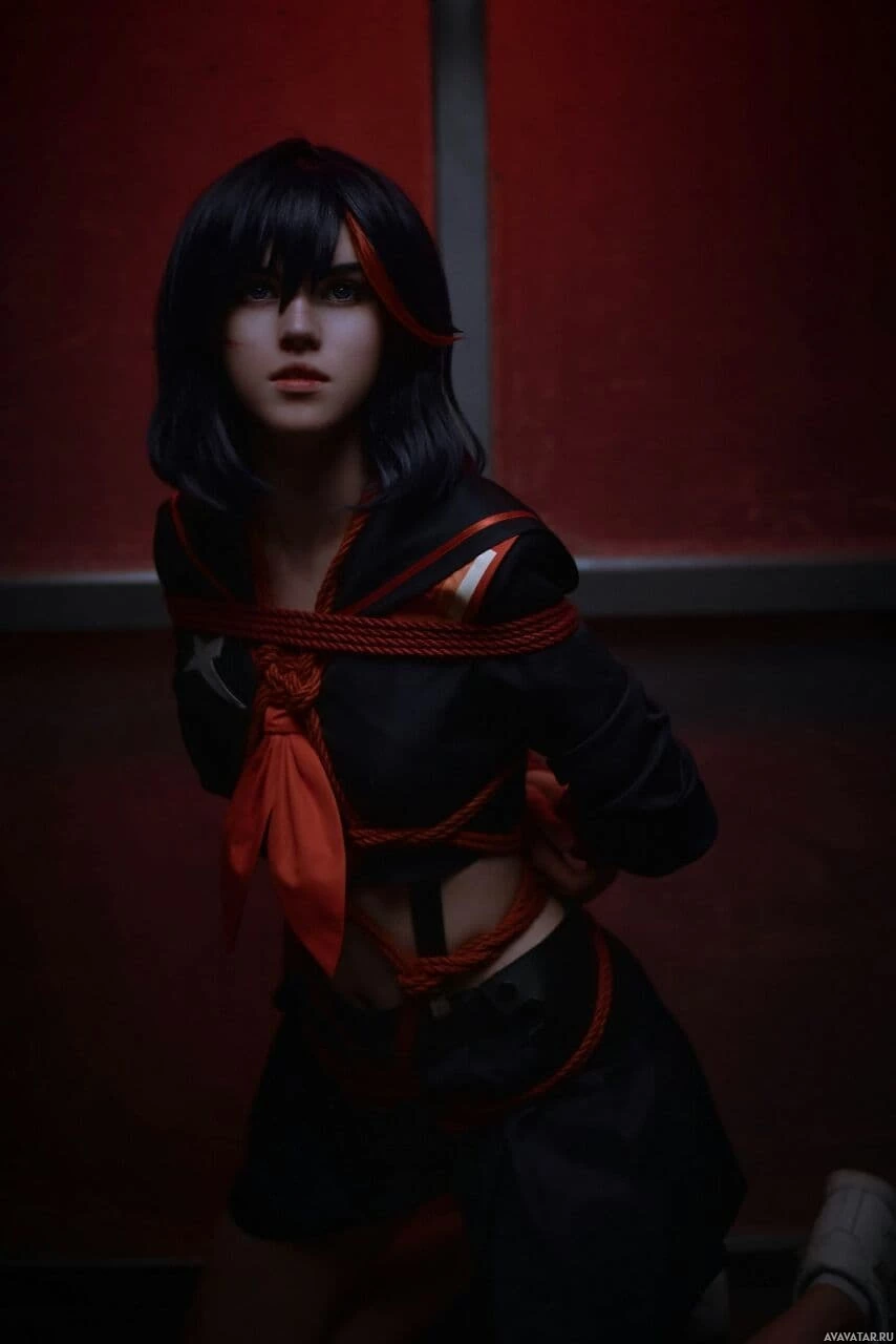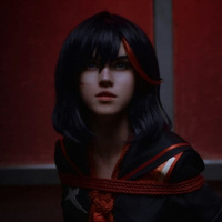 a red scarf or tie around their neck and wrists. The background is dark and minimalistic, which puts focus on