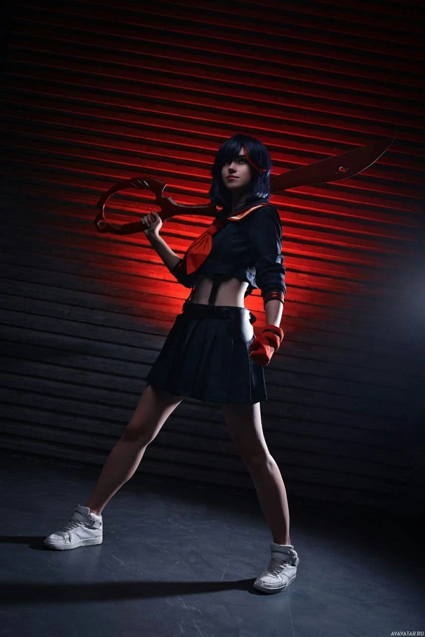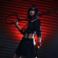 a school uniform with a red tie and a skirt, a black blazer with a red collar, white gloves, and sneakers. The individual is also wearing