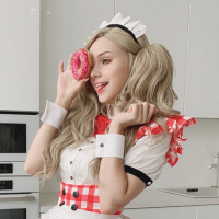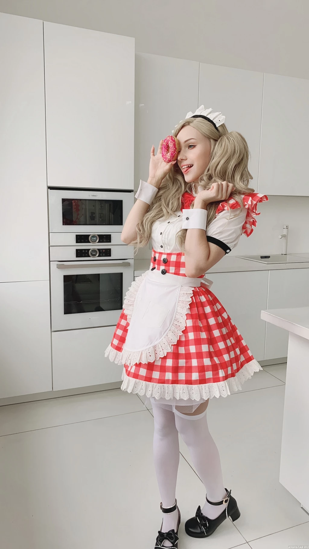 an indoor setting, possibly a kitchen or dining area, with cabinetry and appliances visible behind the person.
