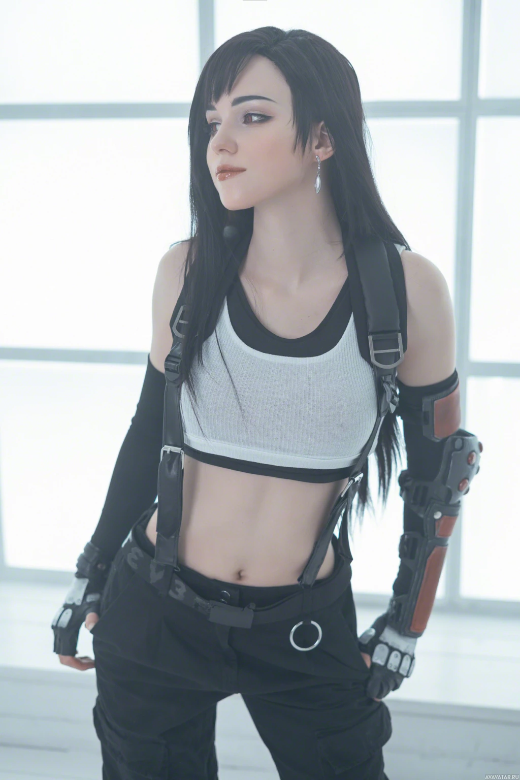 long hair, dark eyes, and is wearing a black and white outfit with elements that could suggest a combat or adventure role, such as straps and arm guards. The setting looks like an indoor studio with