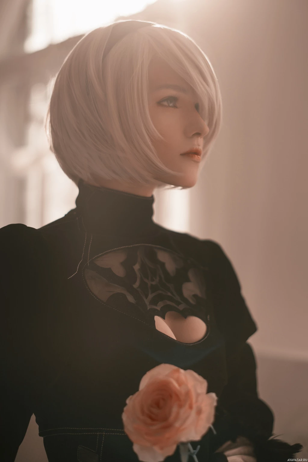silver hair and is dressed in an outfit that resembles the design of a robotic being. She holds a rose in her hand. The setting appears to be indoors with