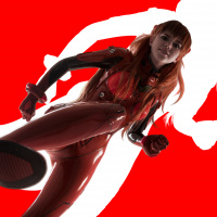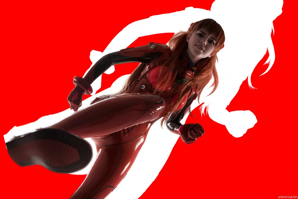 Genesis Evangelion" series, specifically Asuka Langley Soryu. She is depicted in her signature red plug suit and is running with
