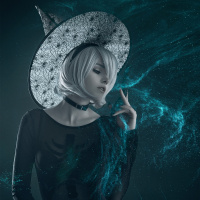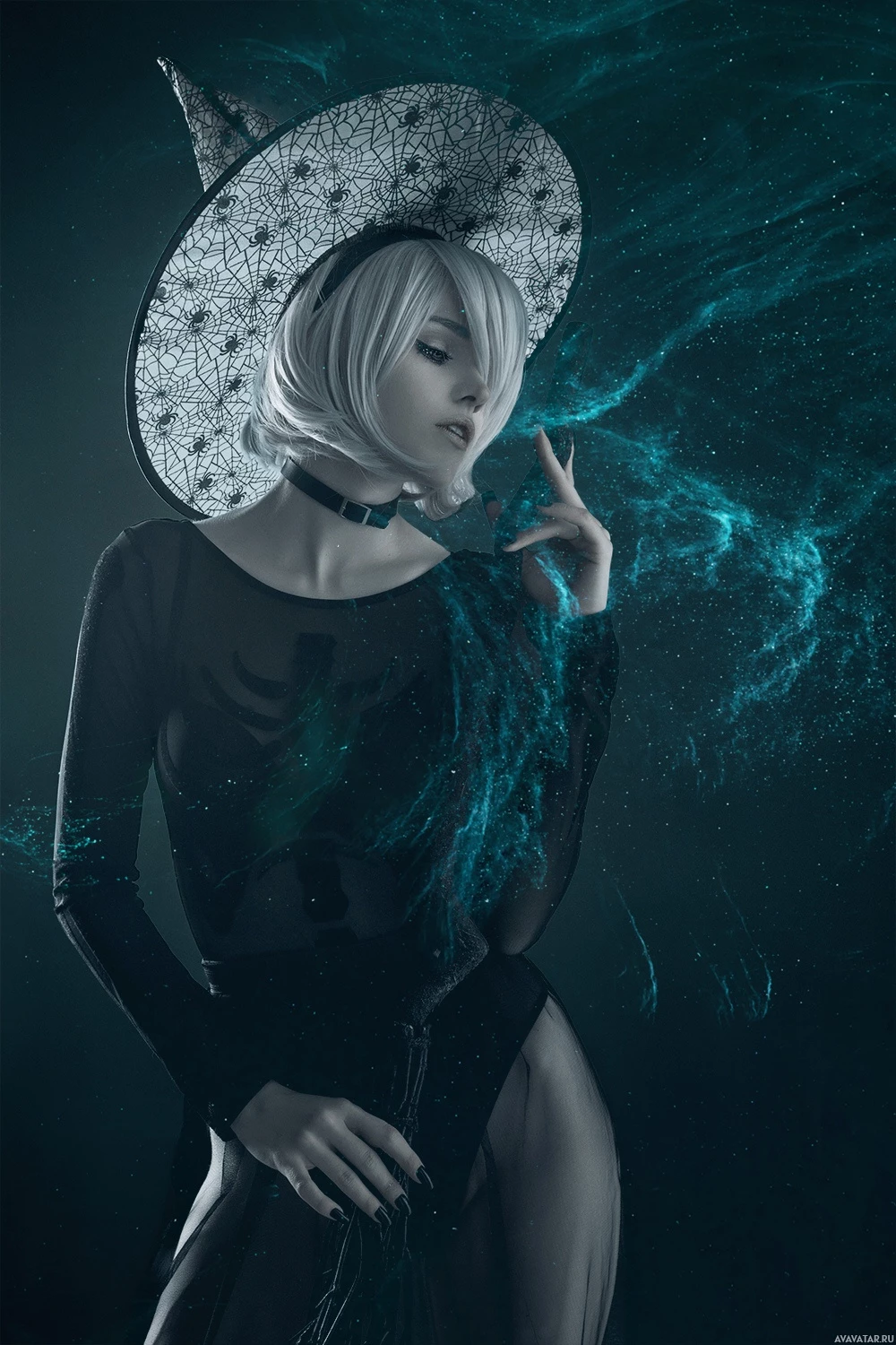 white hair and is wearing a pointed witch's hat, a black garment with intricate details that suggest a mystical or magical theme, and their hand is placed near their face as if casting a spell or making an enchanting gesture. The background features blue and green lights that give the impression of