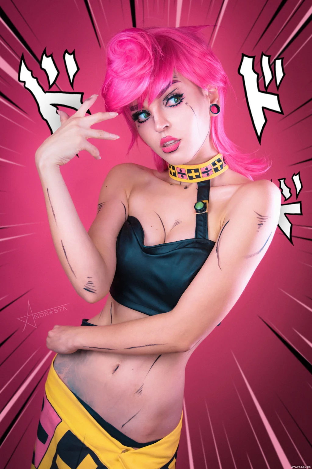pink hair, which matches the character's hair color, and is wearing a black bodysuit with stitched patterns on the chest that resemble wounds. There are also visible accessories such as earrings and what appears to be a collar or necklace with