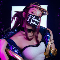 an indoor space, possibly a stage or photography area, with a purple light effect and what looks like a digital display screen in the background. The person is posing confidently, showcasing their cosplay attire, which is consistent with the character they are portraying from "League of Legends."