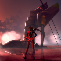 Asuka Langley from the "Neon Genesis Evangelion" series. The character is depicted in cosplay, which means that someone is dressing up as this character for fun or performance purposes. The setting seems to be a futuristic or science fiction environment, with