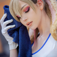 The image shows a person who appears to be dressed in cosplay, likely portraying a character. The character has closed eyes and is wearing an outfit that resembles
