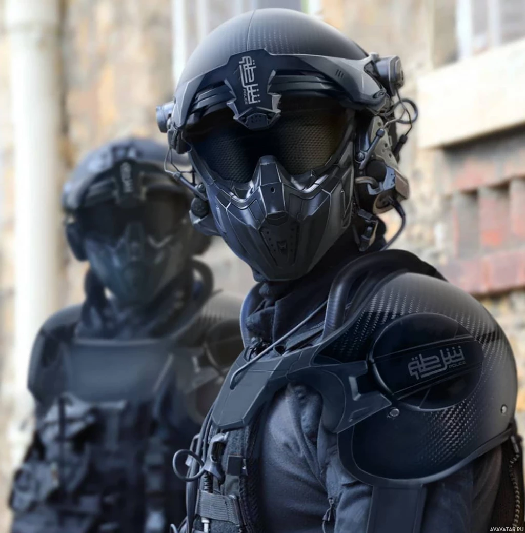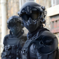 military gear. This includes a full-face mask with visors, which could suggest either specialized protective equipment or a fictional character from media such as video games or movies that depict futuristic or