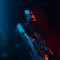 The image depicts a character wearing a hooded cloak and a mask, holding what appears to be a firearm with advanced features. The setting suggests a high-tech or futuristic environment, possibly related to science fiction or gaming culture.