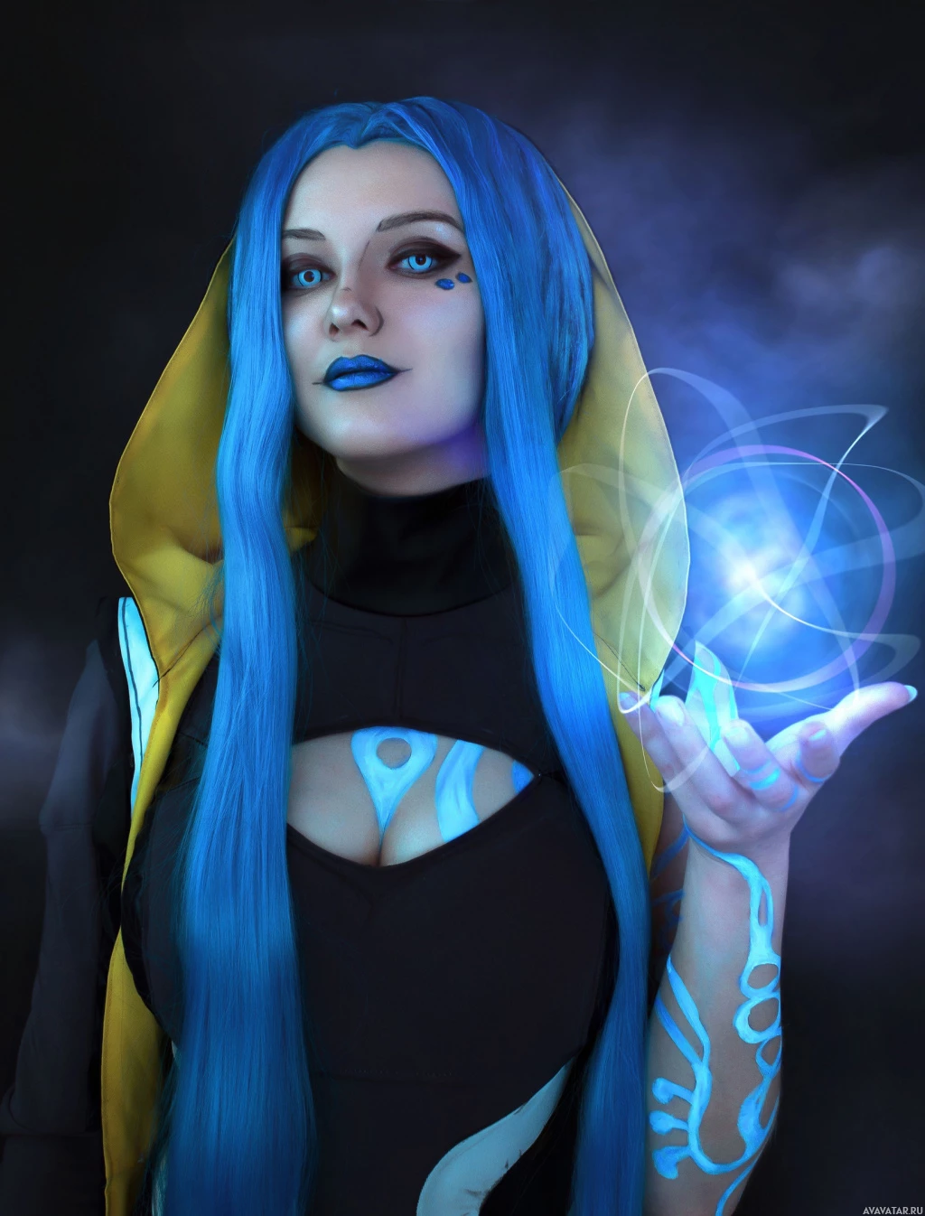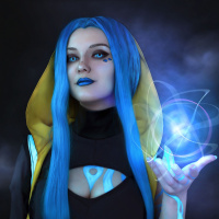 blue hair, holding a magical or mystical object in their hand that appears to be a floating crystal. They are wearing makeup and costume elements that suggest they might be portraying a fantasy or