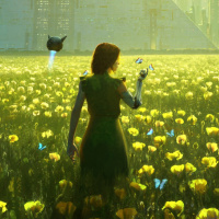 a young girl standing in the foreground, facing away from the viewer. She appears to be in a field of
