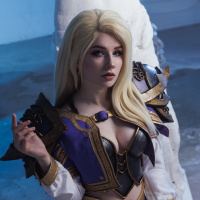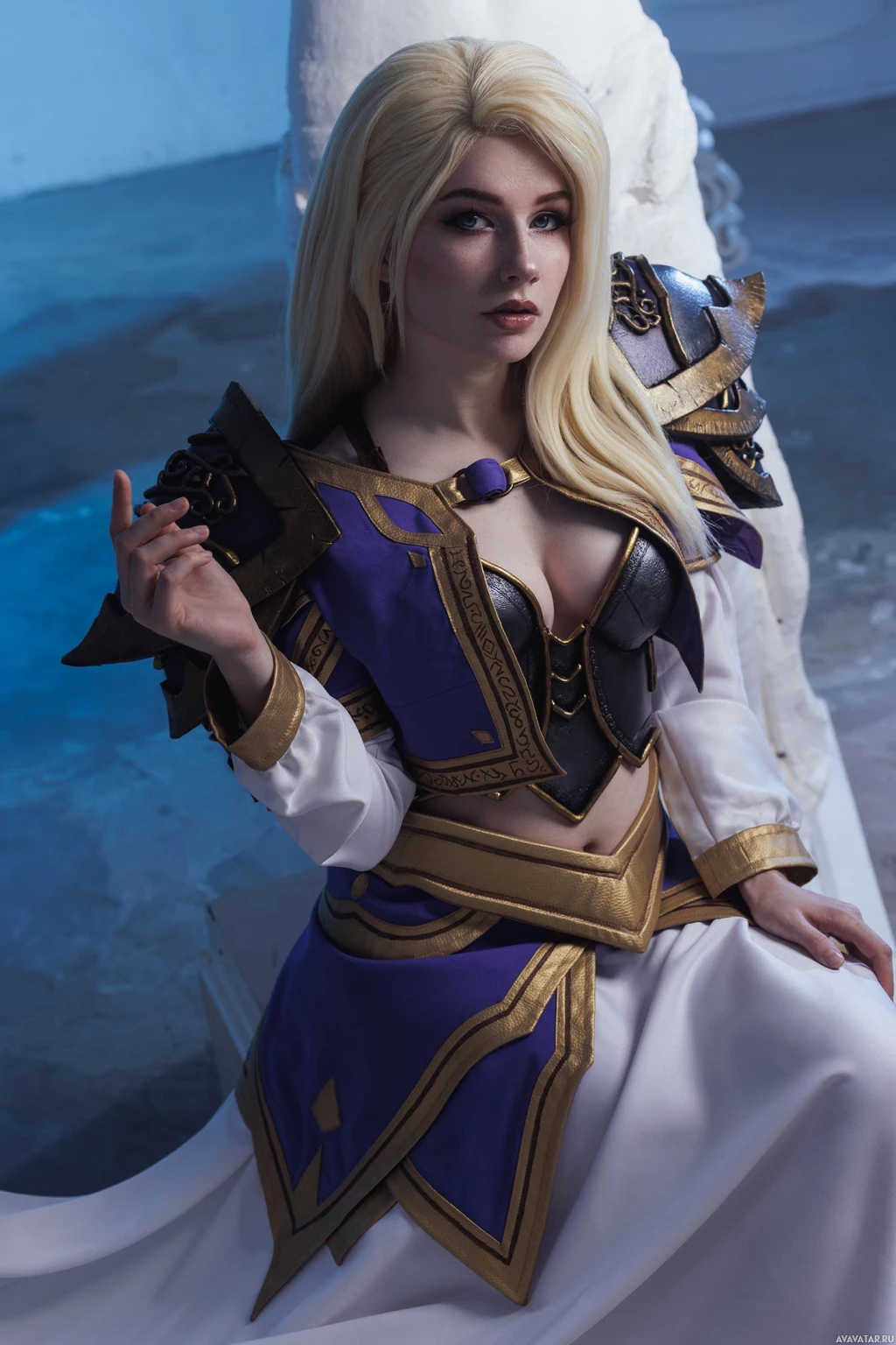 The image features a person dressed in an elaborate cosplay costume that is reminiscent of Jaina Proudmoore, a character from