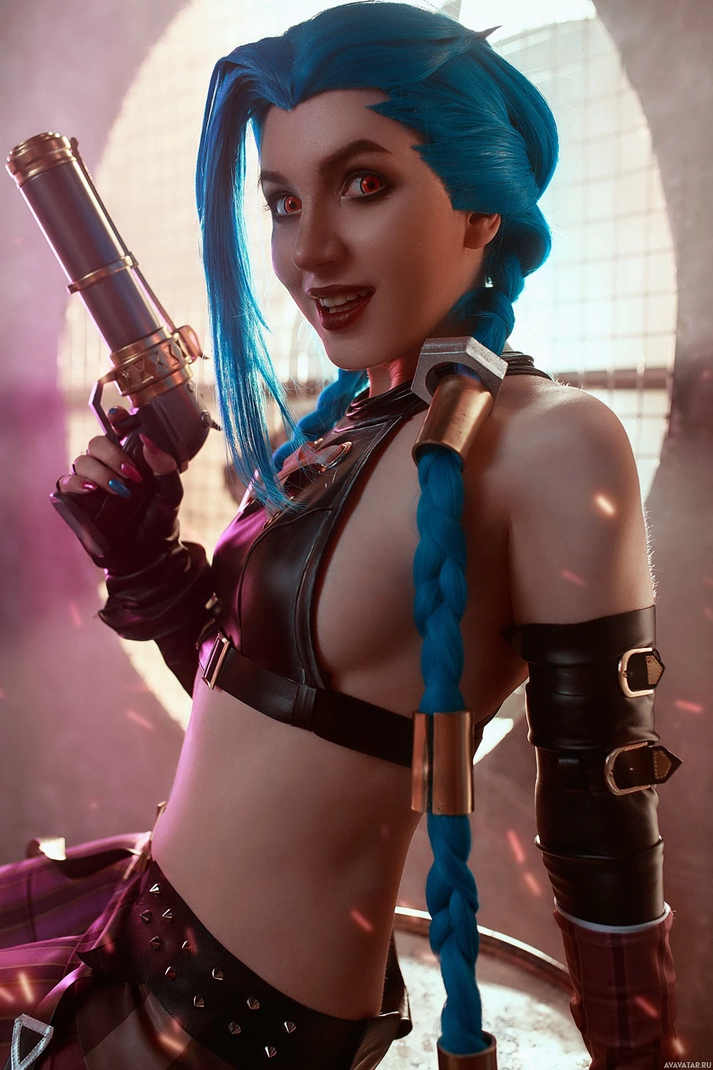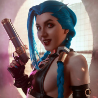 blue hair braids that are styled in a twisted fashion, reminiscent of Jinx's distinctive hairstyle from the game "League of Legends." She also sports a pair of goggles over her eyes and is holding what appears to be a pistol. The character is posed with one leg crossed over the other in a stylized fashion, which contributes to her edgy appearance. In the background, there are industrial elements that suggest an urban or underground setting, which might align with the visual style of the "