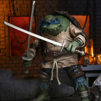 Mutant Ninja Turtles franchise. This character is known as Leonardo, and he is depicted wielding swords in each hand while standing in what appears to be a themed room or display, possibly designed for cosplay or collectible purposes. The figure is dressed in detailed costume that includes a brown belt with buckle, pants, and a tunic resembling the character's