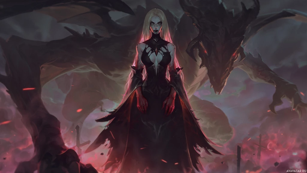 a female character, who appears to be blonde and wearing armor. She is standing in front of two dragons; one on each side of her. The setting seems dramatic with fiery elements and