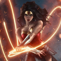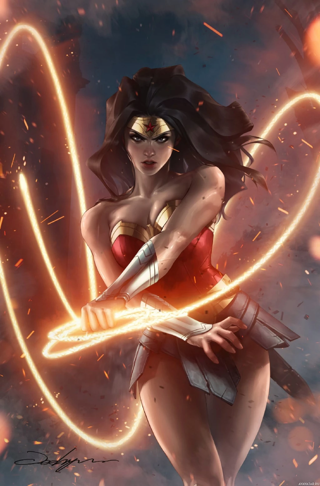 the Lasso of Truth, another iconic weapon from her arsenal. The background suggests an intense