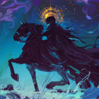 a fantasy scene with a rider, likely a knight or a similar character, on horseback. The setting appears to be at night with a dramatic sky filled with clouds and possibly