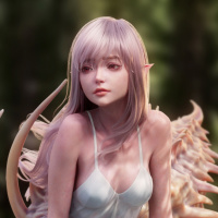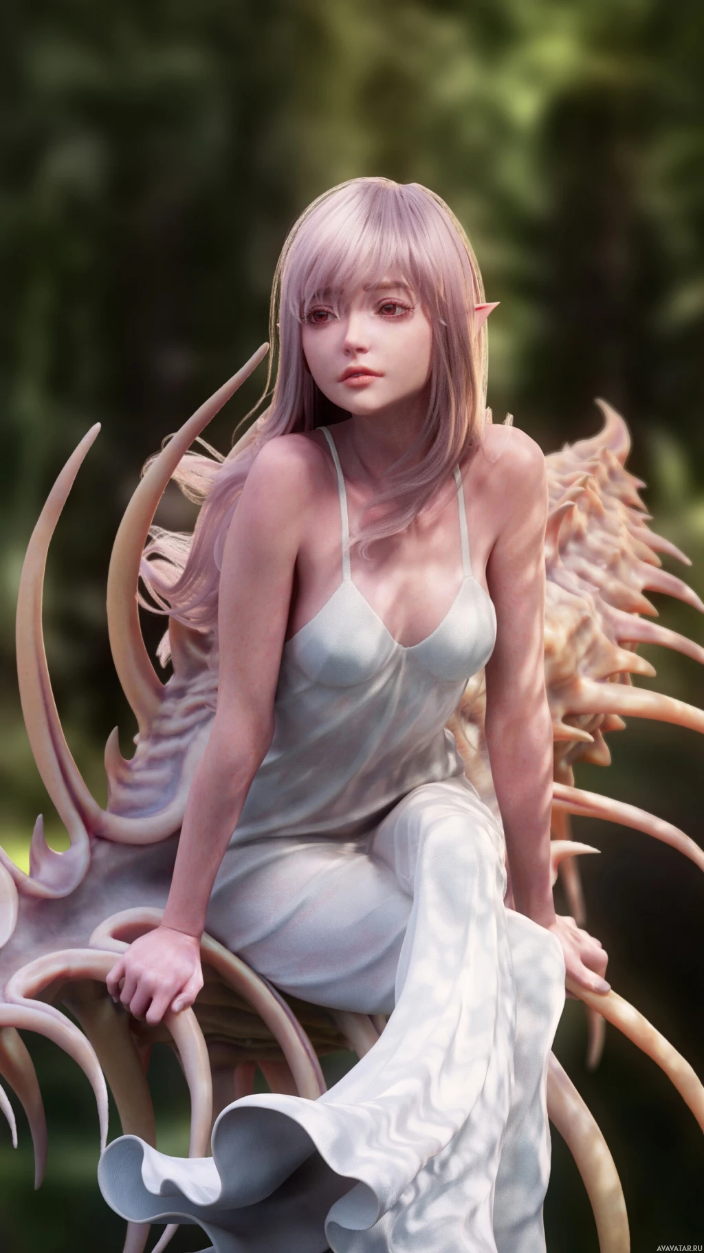 a natural environment, perhaps a forest or a jungle, indicated by the blurred background that suggests a dense vegetation. The character has pale skin and pointed ears, typical features for elves in