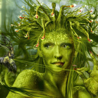 a female character with features that blend human and plant elements. She has a face with human-like eyes, nose, mouth, and jawline but also has leaves and flowers growing on her head like hair. Her skin appears to be green in color. There are insects around her—a bee hovering near her face and possibly other bugs nearby. The background suggests