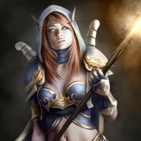 a female character with red hair, dressed in armor that appears to be inspired by fantasy or gaming themes. She has