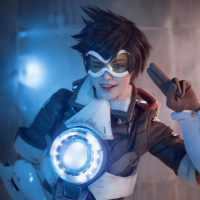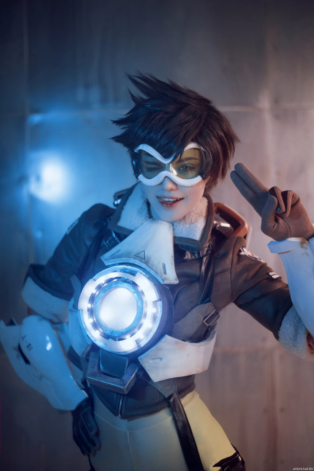 the video game Overwatch. The individual is wearing a futuristic outfit with goggles, a helmet, and what appears to be