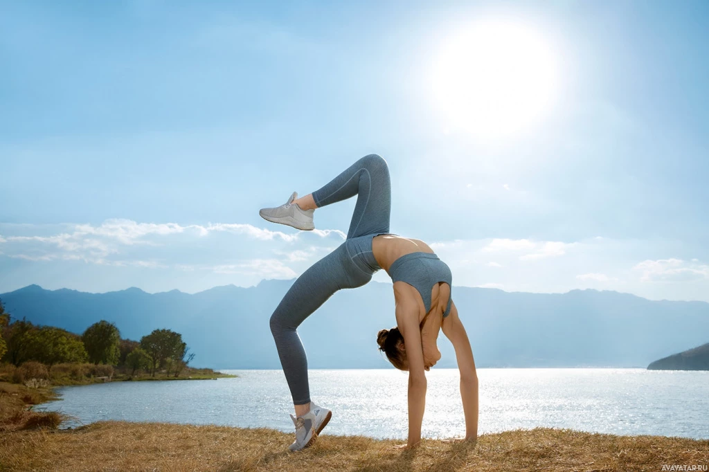 На картинке изображен человек, занимающийся йогой на берегу водоема. Он одет в спортивную одежду и, похоже, выполняет упражнения на балансировку или растяжку. На заднем плане изображена спокойная природная обстановка, которая может быть озером или спокойным участком реки.