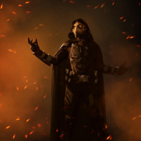 The image features a character that resembles the villainous Sith Lord Darth Sidious from the "Star Wars" franchise. He is depicted with his arms raised and appears to be standing amidst dramatic lighting effects, possibly representing fire or energy. The character's attire and posture suggest he is in a scene of power or conquest.