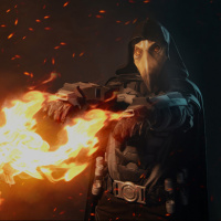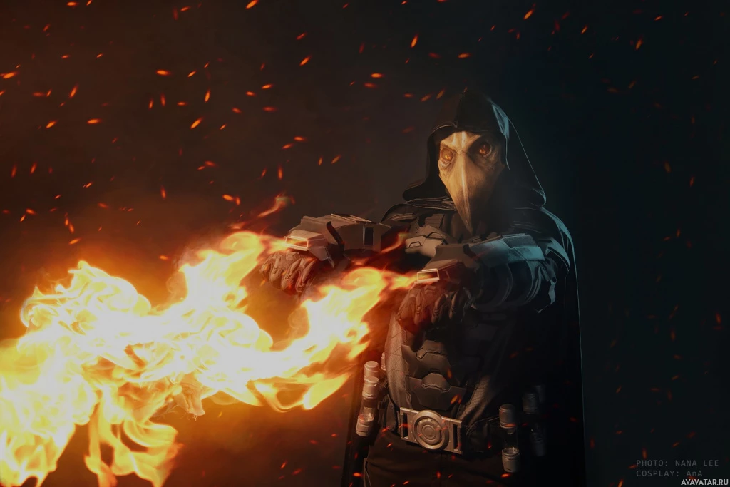 action pose, holding two guns with flames coming out of them, suggesting he may be shooting them at an enemy or engaging in combat. The setting appears to be a dark and