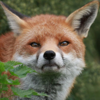 a red fox. The fox is standing on all fours and appears to be looking directly at the camera. Its fur is a rich, reddish