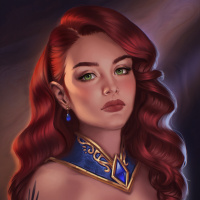 red hair, wearing fantasy-inspired attire. She is dressed in what appears to be armor or a protective vest adorned with
